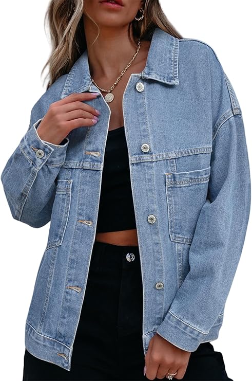 Womens Oversized Jean Jacket Casual Button Up Denim Overshirt Trendy Long Sleeve Denim Jacket Coat