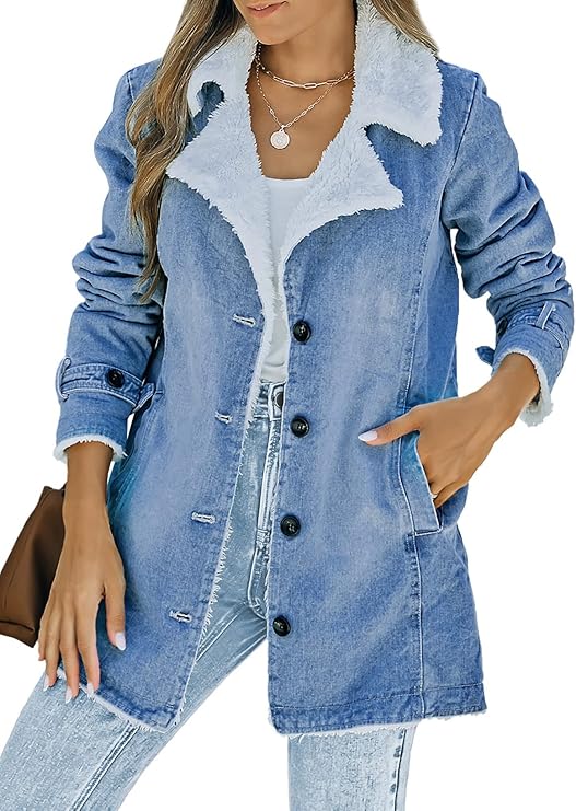 Womens Winter Warm Jean Jacket Stand Collar Wool Liner Sherpa Denim Coats Thicker Outerwear with Pockets