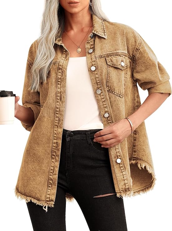 Jean Jacket Women Oversized Casual Distressed Denim Jacket Button Down Long Sleeve Shirt Coat with Pockets