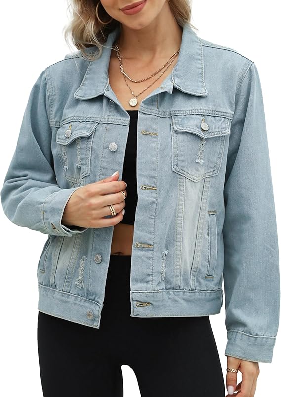 Women's Jean Jacket Frayed Washed Button Up Cropped Denim Jacket With Pockets S-XXL