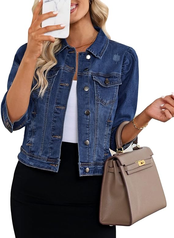 Womens Jean Jacket Cropped Denim Jackets Stretchy 3/4 Puff Sleeve Distressed Shacket with Pockets