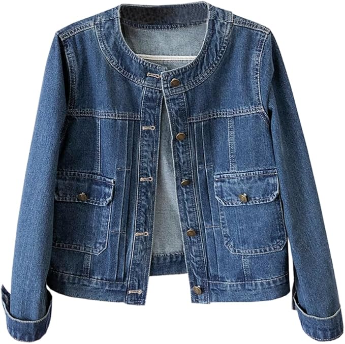 Women’s Collarless Long Sleeve Denim Jacket Round Neck Button Down Jean Jackets