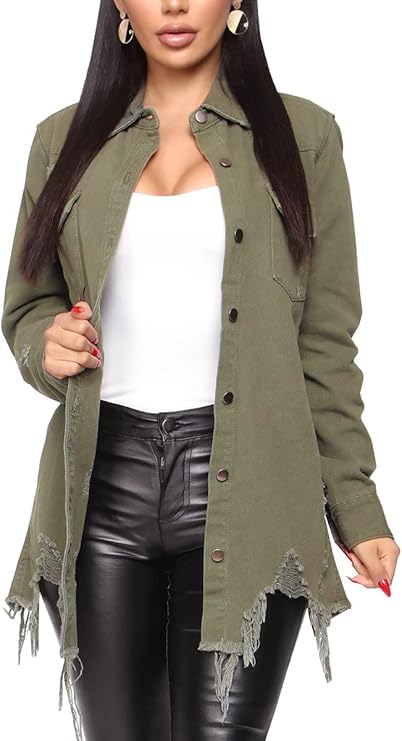 Jean Jackets for Women Ripped Fringe Denim Jean Jacket Casual Long Sleeve Pockets Jackets Coat