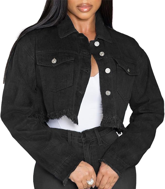 Jean Jacket for Women Cropped Denim Jackets Button Down Long Sleeve Fitted Crop Top Frayed Hem Jean Coat