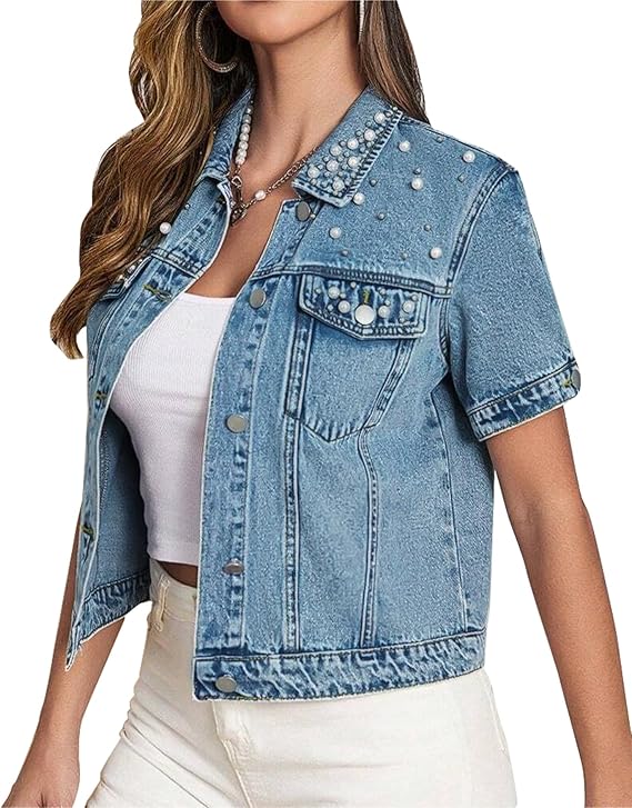 Women's Pearls Denim Jacket Casual Short Sleeve Cropped Jean Jackets Coats